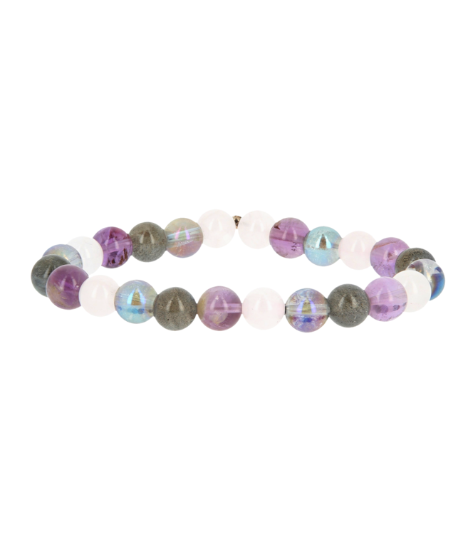 ll est composé de pierres de quartz aura aqua, labradorite, améthyste cacoxénite (inclusions) et quartz rose.